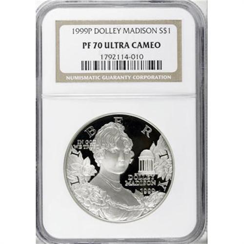 <B>1999-P $1 Dolley Madison Silver Dollar PR70 Deep Cameo NGC.</B></I> NGC Census: (0/0). PCGS Population (55/0). Numismedia Wsl. Price for NGC/PCGS coin in PR70: $220. (#9772)<BR><BR><b>Shipping:</b> Coins & Currency (<a target="_blank" href="http://www.heritageauctions.com/common/shipping.php">view shipping information</a>)