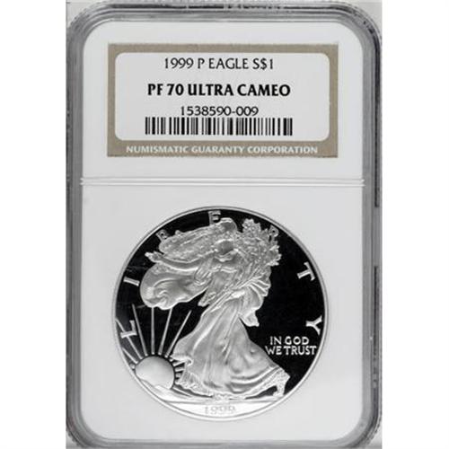 <B>1999-P $1 Silver Eagle PR70 Deep Cameo NGC.</B></I> NGC Census: (388/0). PCGS Population (47/0). Numismedia Wsl. Price for NGC/PCGS coin in PR70: $500. (#9948)<BR><BR><b>Shipping:</b> Coins & Currency (<a target="_blank" href="http://www.heritageauctions.com/common/shipping.php">view shipping information</a>)