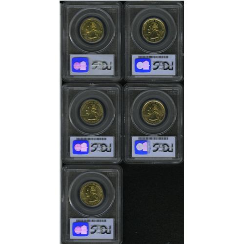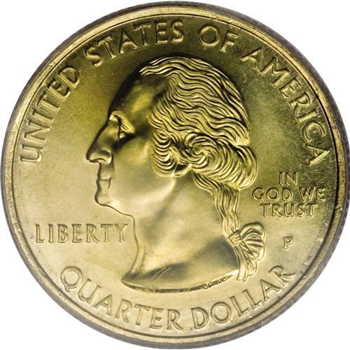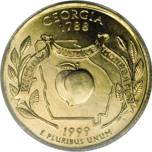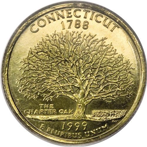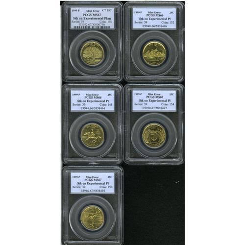 <B>1999-P 25C Connecticut MS67 PCGS.</B></I><B>Five Piece Set of 1999-P Golden Alloy Experimental Planchet State Quarters MS66 to MS67 PCGS.</B></I> The set includes the 1999-P Delaware, Pennsylvania, New Jersey, Georgia, and Connecticut designs, each struck in a golden alloy. The Delaware and New Jersey quarters are graded MS66, and the Pennsylvania, Georgia, and Connecticut quarters grade MS67. The story behind these pieces is closely related to the advent of the Sacagawea dollar. By 1999, the once bountiful Treasury hoard of unreleased Susan B. Anthony dollars was depleted due to dispersal from Post Office and New York subway vending machines. A new small-sized Dollar needed to be struck, this time with a gold-colored alloy so that it would not be mistaken for a quarter. Apparently, dollar-sized planchets were not yet available, and gold-coloring experiments were conducted instead on the various Statehood quarter types of 1999. Four experimental composition types are known, either with gold or greenish color, and with and without a copper core. These essentially immaculate pieces have the brassy yellow-gold color of a new Sacagawea dollar, but it is unknown whether they contain a copper core. Regardless, these are very rare, deliberately produced off-metal strikes that were not supposed to reach collector's hands. Each have an unusually sharp strike for a business strike state quarter. Several of the pieces have minor laminations or lintmarks near the rims that correspond with their experimental nature. In addition, the rims are irregular, stretched, and rather flat, as if the collar dies were improperly wide. The Georgia piece is the exception, and has a nearly normal raised rim. This experimental planchet set would be extremely difficult to reproduce.<BR><BR><b>Shipping:</b> Coins & Currency (<a target="_blank" href="http://www.heritageauctions.com/common/shipping.php">view shipping information</a>)