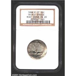 1999-P 25C Connecticut Quarter--Triple Struck--MS65 NGC.<p>Another spectacular Statehood Quarter error. The multiple strikings, two of which are plainly evident, have left the planchet somewhat mangled. Important notice: We expect to be auctioning lots at the rate of 200-250 per hour. Sometimes eBay Premier live bid software cannot keep up with that pace, so we strongly recommend that you place a realistic proxy bid now as insurance to avoid disappointment. Also please note that all Heritage/CAA lots purchased through eBay Premier carry a 20% Buyer's Premium.