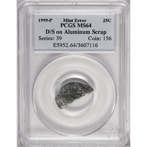 <B>1999-P<25C> Connecticut Statehood Quarter--Double Struck on Aluminum Scrap--MS64 PCGS.</B></I> Perhaps struck on a feeder finger, this quarter displays a full Philadelphia mintmark in addition to much of the Charter Oak and portrait. Peripheral legends are moderately strike doubled, which may constitute the second strike indicated on the PCGS holder.