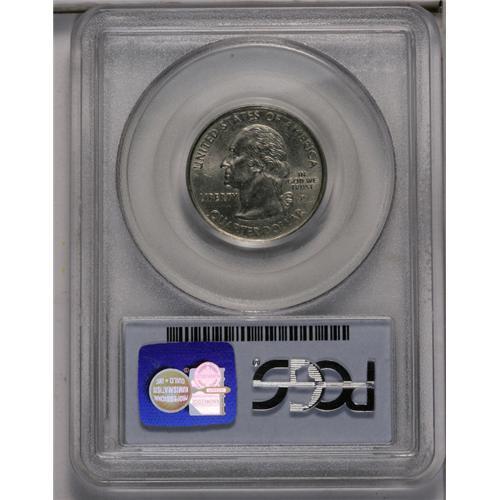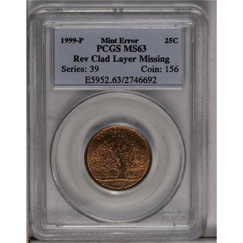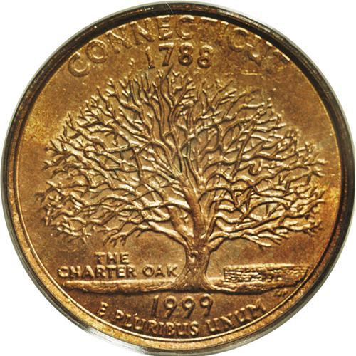 <B>1999-P<25C> Connecticut Statehood Quarter--Statehood Clad Layer Missing--MS63 PCGS.</B></I> The statehood side is mostly full Red, despite an occasional hint of gray toning within the branches. The central strike is relatively sharp, while peripheral legends are softly defined. A thin diagonal mark above Washington's eye limits the grade.