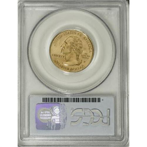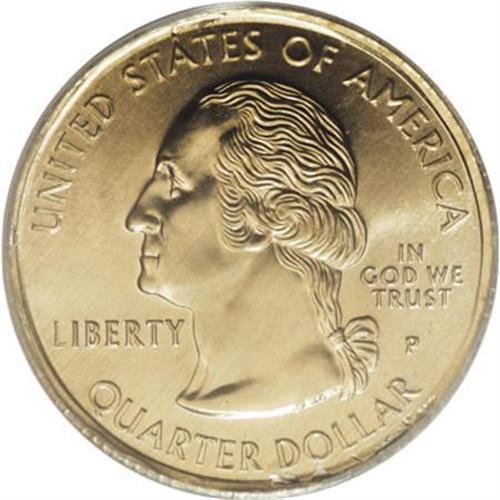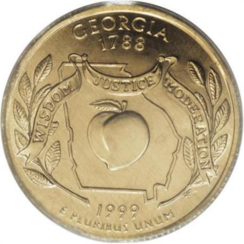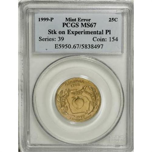 <B>1999-P 25C Georgia Quarter--Struck on an Experimental Planchet--MS67 PCGS.</B></I> There are four separate categories of these planchets. The four types are covered in the November 26, 2001 issue of <I>Coin World</B></I>. This coin appears to be a Type Two, with the color of a Sacagawea dollar but no copper core. On the rim below the DO of DOLLAR is crumbling that is deep enough to expose the underlying core of what appears to be nickel. All four types are heavier and thicker than a normal quarter, and all have raised and rough rims. A Superb example of this interesting and presumably rare 1999 experimental striking.<BR><BR><b>Shipping:</b> Coins & Currency (<a target="_blank" href="http://www.heritageauctions.com/common/shipping.php">view shipping information</a>\)