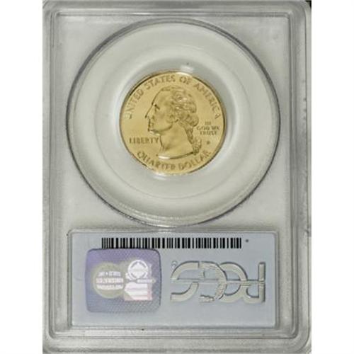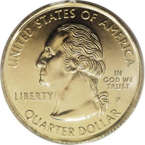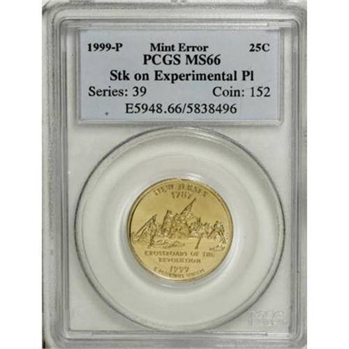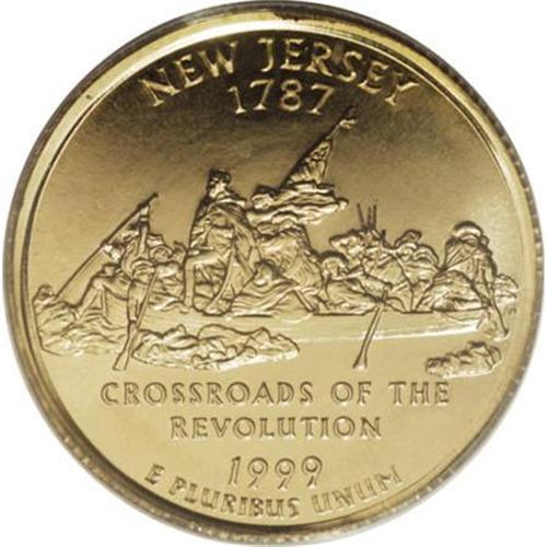 <B>1999-P 25C New Jersey Quarter--Struck on an Experimental Planchet--MS66 PCGS.</B></I> Gold-colored alloy experiments were conducted in 1999 using state quarter dies, presumably because no mini-dollar dies were available. Those experiments eventually culminated in the manganese-alloy Sacagawea dollar. This virtually pristine piece has the brassy yellow-gold color of a new Sacagawea dollar and an unusually sharp strike. As usual for these 1999 experimental pieces, there are a few minor lintmarks near the borders, and the rims are irregular, stretched, and rather flat, as if the collar die was improperly wide.<BR><BR><b>Shipping:</b> Coins & Currency (<a target="_blank" href="http://www.heritageauctions.com/common/shipping.php">view shipping information</a>)
