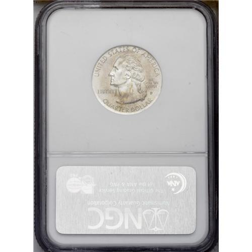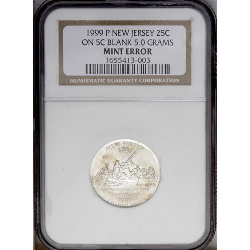 <B>1999-P<25C> New Jersey Statehood Quarter--Struck on a Nickel Planchet--MS60 NGC.</B></I> 5.0 grams, standard weight for a nickel planchet. Nicely centered with all peripheral lettering complete. A splendid example, fully brilliant and highly lustrous, approaching Gem quality, although there is no grade included on the NGC label, thus we have elected to record this as MS60, although it is clearly finer. Splashes of light gold toning are visible on each side.