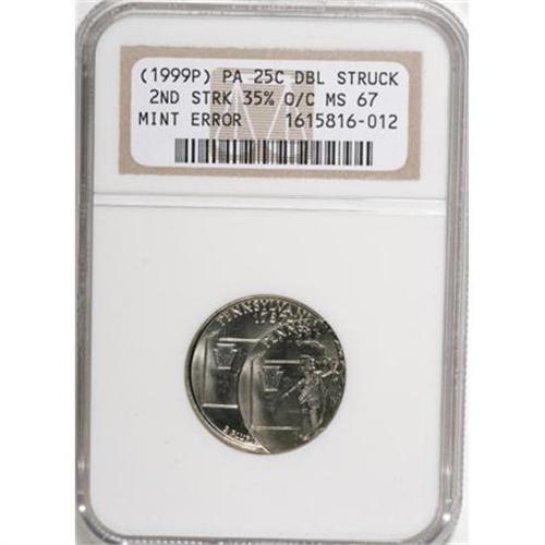 <B>1999-P 25C Pennsylvania Statehood Quarter--Double Struck, 2nd Strike 35% Off Center--MS67 NGC.</B></I> <BR><BR><b>Shipping:</b> Coins & Currency (<a target="_blank" href="http://www.heritageauctions.com/common/shipping.php">view shipping information</a>)