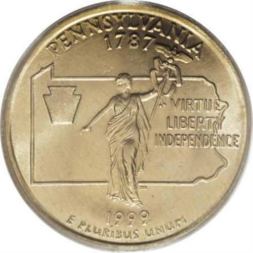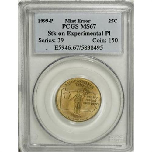 <B>1999-P 25C Pennsylvania Quarter--Struck on Experimental Planchet--MS67 PCGS.</B></I> Various "golden" alloys were tested on a few 1999-dated Statehood quarters. The exact metallic content of each would need to be metallurgically tested, but it would make an interesting study if a collector could gather enough pieces together and then pursue testing. This is a bright "golden" coin that shows noticeable metal flow around the margins, indicating this experimental alloy was not tested at the beginning of the production run for Pennsylvania quarters. <BR><BR><b>Shipping:</b> Coins & Currency (<a target="_blank" href="http://www.heritageauctions.com/common/shipping.php">view shipping information</a>)