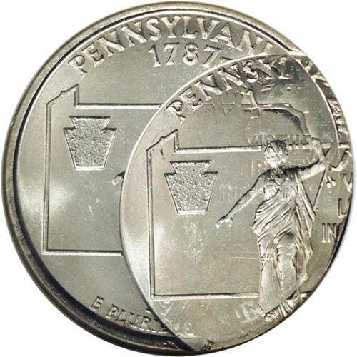 <B>1999-P<25C> Pennsylvania Statehood Quarter--Double Struck, Second Strike 35% Off-Center--MS67 NGC.</B></I> Much like the double struck Delaware quarter, the second strike of this example is 35% off-center at 2 o'clock (obverse). A brilliant and satiny Superb Gem with lustrous light gray surfaces and hints of gold color on each side.
