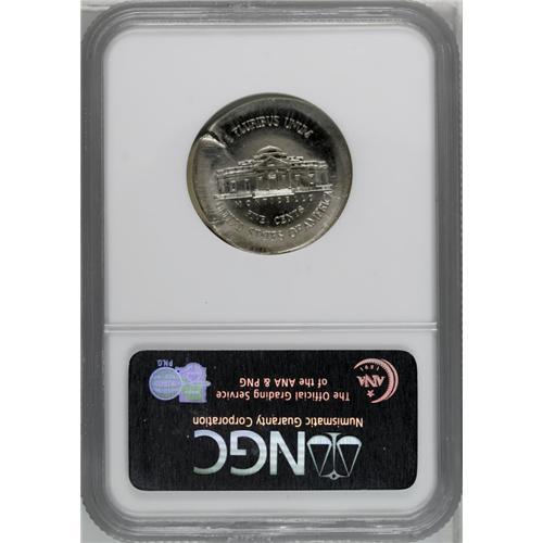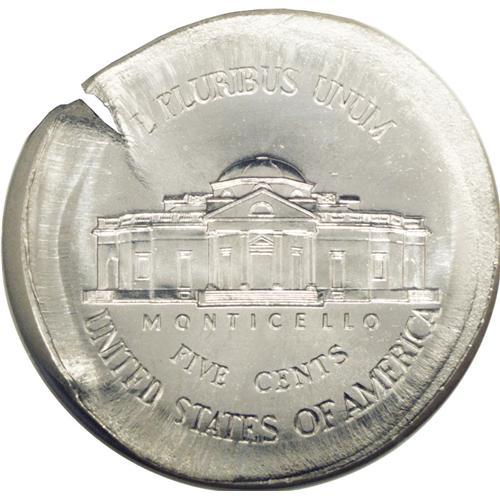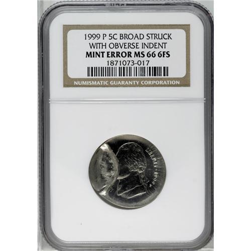 <B>1999-P<5C> Jefferson Nickel--Broadstruck with Obverse Indent--MS66 Full Steps NGC.</B></I> Nicely centered broadstrike with an indent over approximately 30% of the obverse. The planchet is cracked near the lower edge of the indent. A lovely, highly lustrous light gray example with sharp design elements and reflective fields.