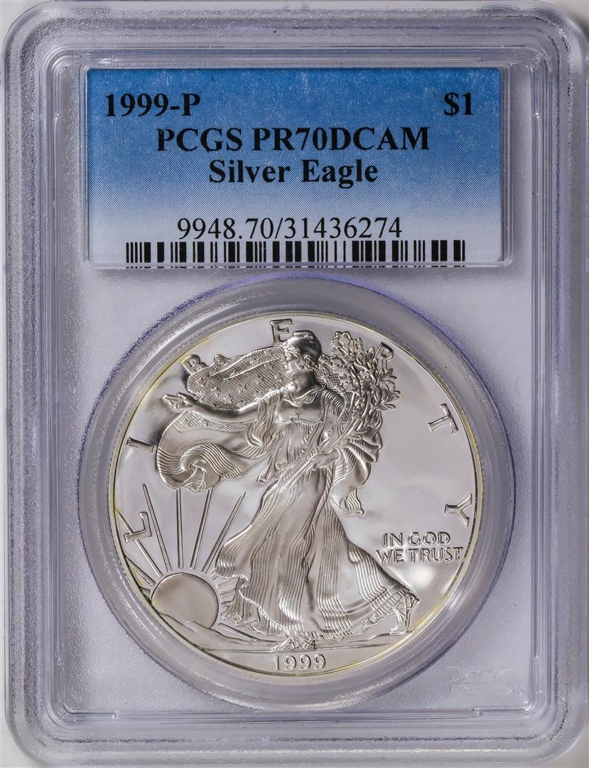 One 1999-P American Silver Eagle .999 Fine Silver Dollar Coin PCGS PR70DCAM.