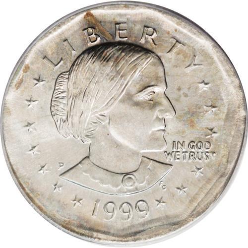 <B>1999-P<img border='0' src='http://www.heritagecoins.com/images/star.gif' width=10 height=10>BA$> Anthony Dollar--Broadstruck Out of Collar--MS64 PCGS.</B></I> This centered broadstrike is fully lustrous and displays curious but attractive golden-brown, powder-blue, and aqua toning. Peripheral elements are stretched toward the rim, customary for a broadstrike error.