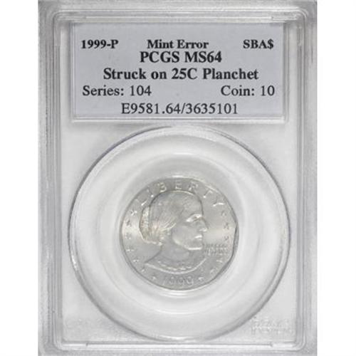<B>1999-P SBA$ Anthony Dollar--Struck on Quarter Dollar Planchet--MS64 PCGS.</B></I> A lustrous light golden-brown representative that lacks relevant marks. All legends are complete, but the strike is slightly uncentered toward 10:30. The mintage for the 1999-P Anthony dollar was less than 30 million pieces, and wrong-planchet errors are seldom encountered.<BR><BR><b>Shipping:</b> Coins & Currency (<a target="_blank" href="http://www.heritageauctions.com/common/shipping.php">view shipping information</a>)