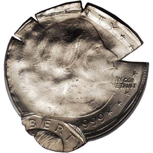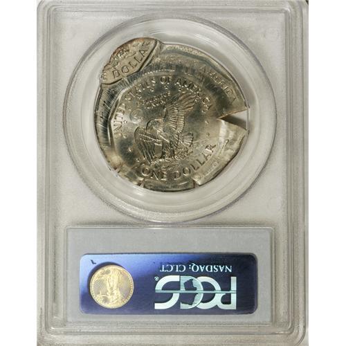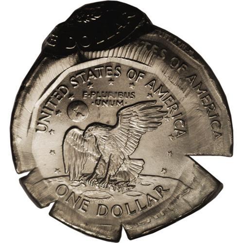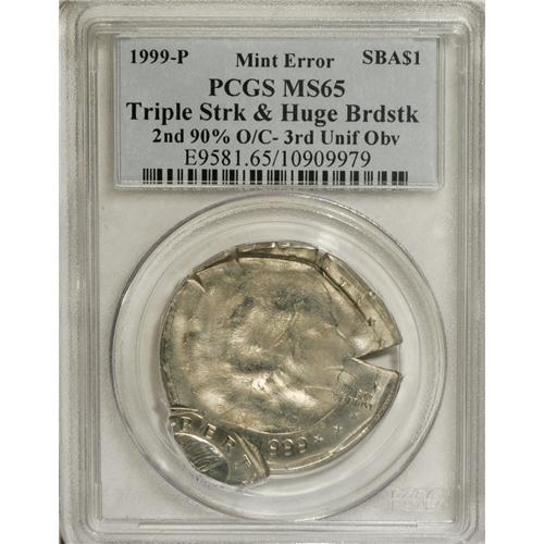 <B>1999-P SBA$ Anthony Dollar--Triple Struck & Huge Broadstrike, Second Strike 90% Off Center, Third Strike Uniface--MS65 PCGS.</B></I> This piece failed to fully eject from the dies after the first strike. The second strike was 90% off center toward 6:30, at 7 o'clock relative to the first strike. For the third strike, which is well centered, a new planchet was fed in (not included) that blocked the obverse die. This third strike caused four peripheral flan cracks. The date from the first strike is bold, and the mintmark is legible although distorted by the uniface reverse strike. It is possible that the off center strike was the third strike, rather than the second strike.<BR><BR><b>Shipping:</b> Coins & Currency (<a target="_blank" href="http://www.heritageauctions.com/common/shipping.php">view shipping information</a>)