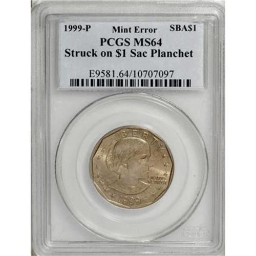 <B>1999-P SBA$ Anthony Dollar--Struck on a Sacagawea Dollar Planchet--MS64 PCGS.</B></I> A lustrous pale honey-gold off metal error. The silver-colored 1999-D Anthony dollar was struck to fulfill post office demand, since the gold-colored Sacagawea dollar was withheld until 2000. Anthony and Sacagawea production likely overlapped in the second half of 1999.<BR><BR><b>Shipping:</b> Coins & Currency (<a target="_blank" href="http://www.heritageauctions.com/common/shipping.php">view shipping information</a>)