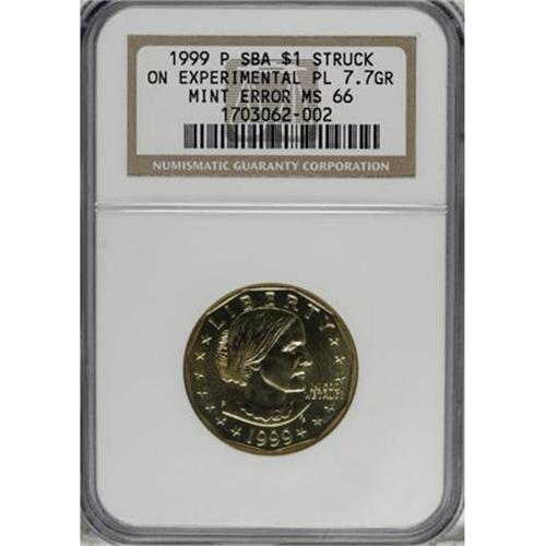 <B>1999-P Susan B. Anthony Dollar--Struck on Experimental Planchet--MS66 NGC.</B></I> 7.7 gm. A gleaming test piece that offers an interesting butter-yellow finish. Carefully preserved and a fascinating relic from the experimental period that preceded the Sacagawea dollar.<BR><BR><b>Shipping:</b> Coins & Currency (<a target="_blank" href="http://www.heritageauctions.com/common/shipping.php">view shipping information</a>)