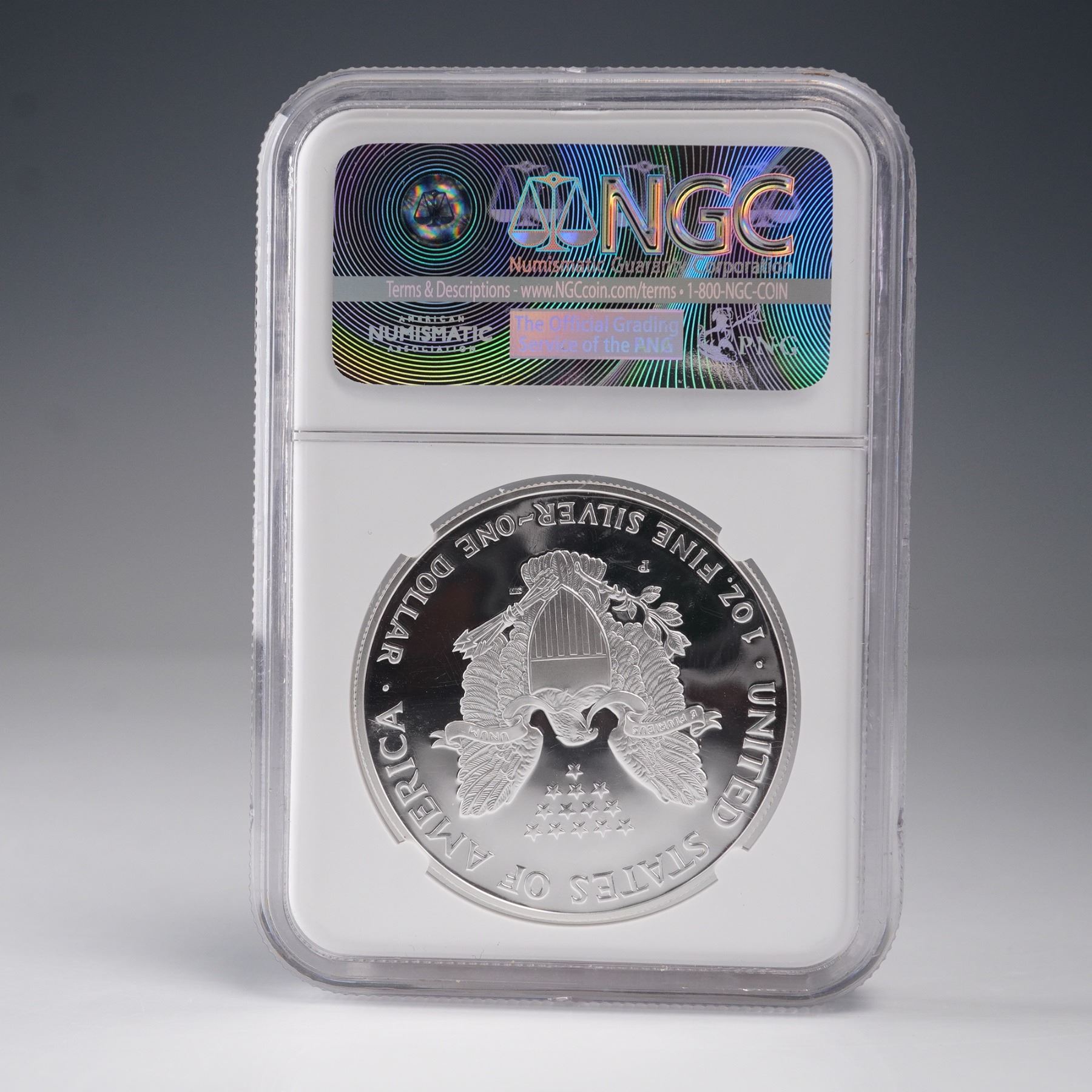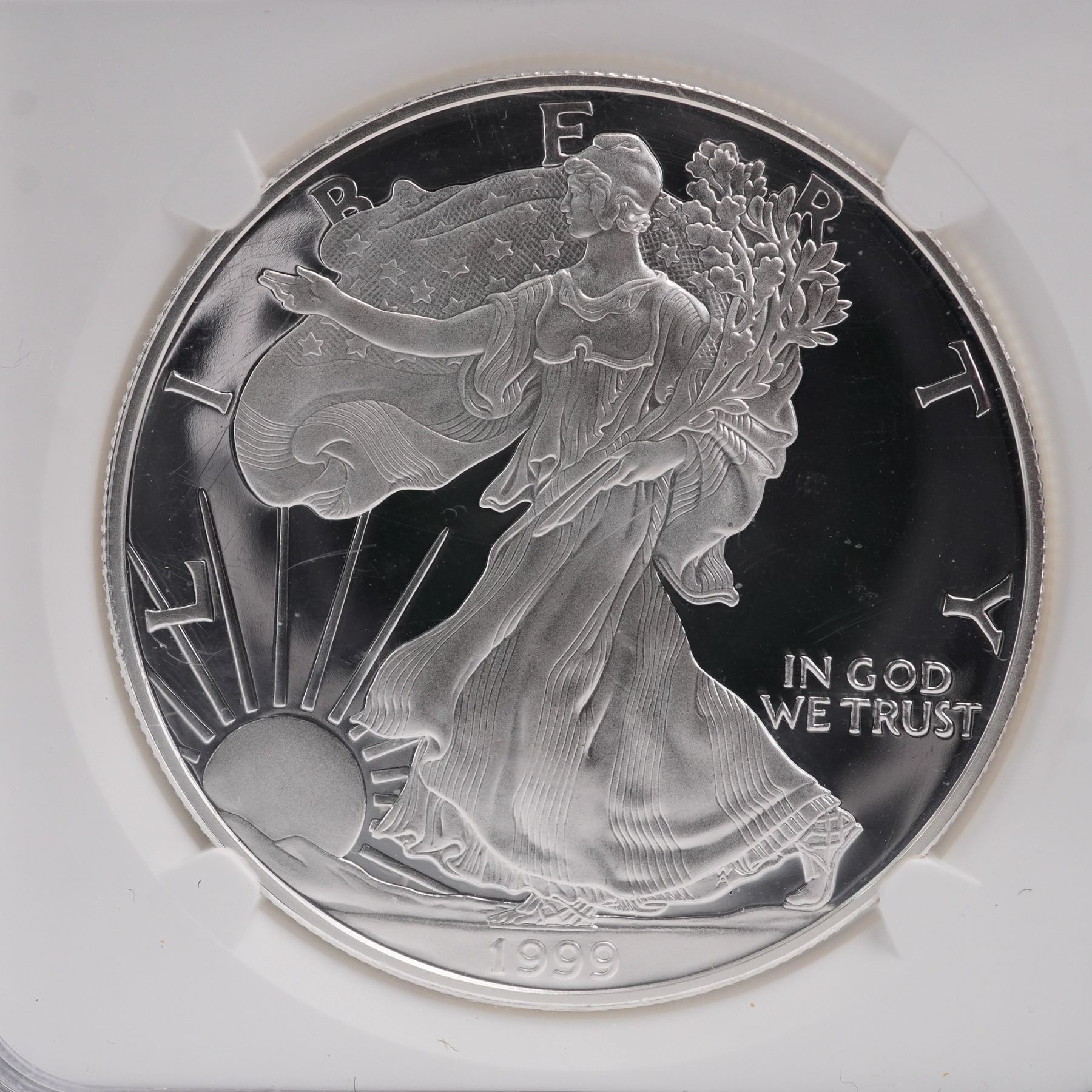 A one-ounce .999 fine silver American Silver Eagle proof coin struck at the Philadelphia Mint in 1999, certified by Numismatic Guaranty Corporation (NGC) with the perfect grade of PF 70 Ultra Cameo. The obverse features Adolph A. Weinman's iconic "Walking Liberty" design, a revival of the 1916 half dollar motif, with Lady Liberty striding toward the dawn's light, draped in the flag of the United States and bearing branches of laurel and oak. The reverse, designed by John Mercanti, displays a heraldic eagle with shield, clutching arrows and an olive branch, with a ribbon inscribed "E Pluribus Unum" and thirteen stars above representing the original colonies. Encapsulated in a tamper-evident NGC holder for protection and authentication. Slab measures: 2.25"L x 0.25"W x 3.25"H. Coin diameter: 40.6 mm.