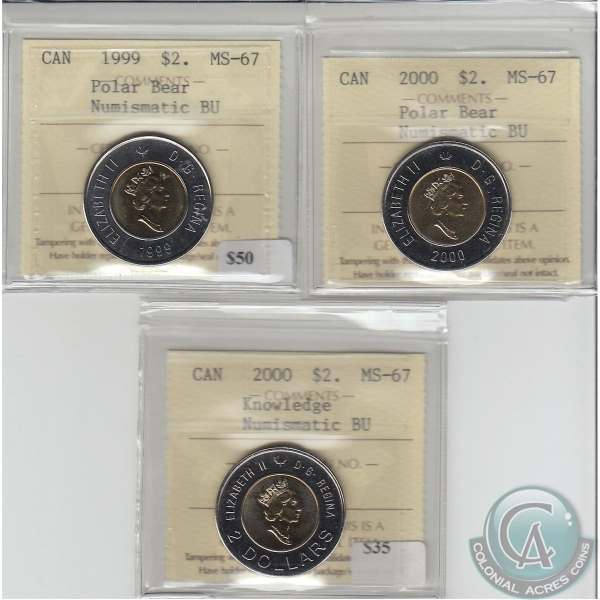 1999 Polar Bear, 2000 Polar Bear & 2000 Knowledge $2 All ICCS Certified MS-67; NBU (3pcs)