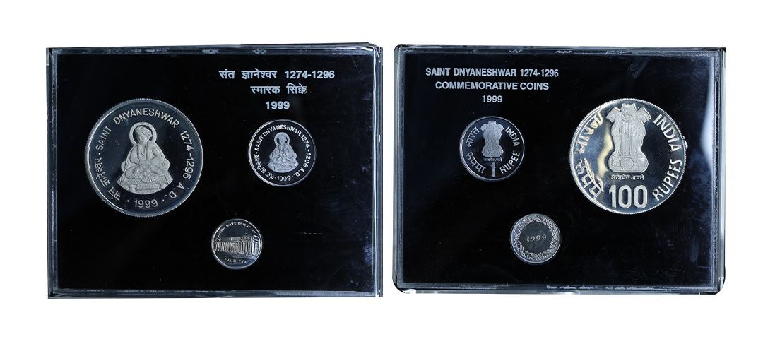 1999 Proof set, Saint Dnyaneshwar, set of 2, Rupee 1 and 100, Kolkata Mint. In immaculate condition, within original packaging, Very Rare. (2); ( from the collection of Mr. I. K. Kejriwal ).