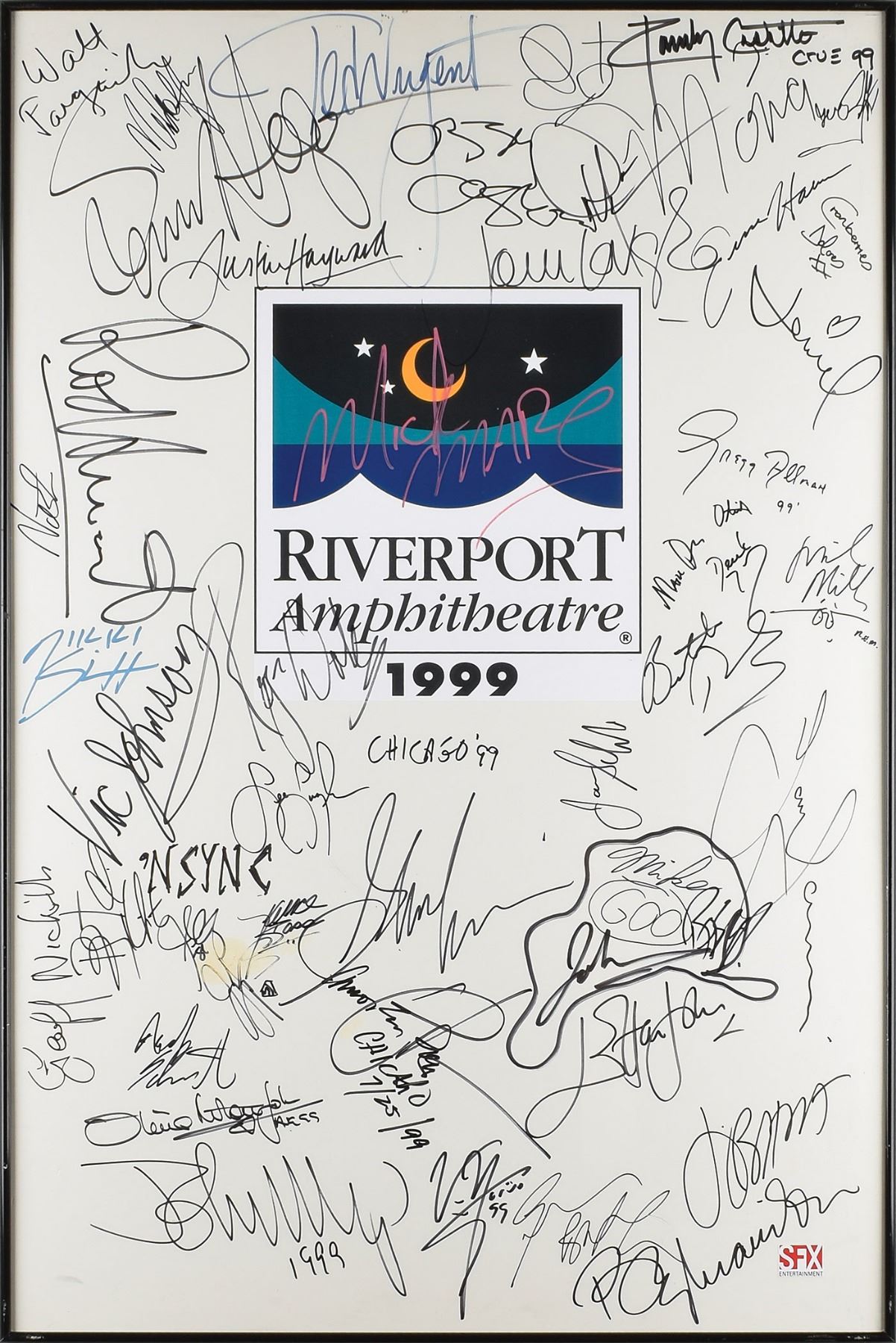 Desirable color 24 x 36 poster celebrating the 1999 concert year at the Riverport Amphitheatre in Maryland Heights, Missouri, signed in various colored felt tip by over 40 musical artists who played the concert venue that year, including: Sammy Hagar, Jewel, Vic Johnson, Barry Manilow, John Mellencamp, Mike Mills, Olivia Newton-John, Ted Nugent, Dolores O'Riordan, Rod Stewart, Roger Waters, Chris Kirkpatrick, Joey Fatone, Lance Bass, and JC Chasez of NSYNC, Lee Loughnane, Walter Parazaider, and James Pankow of Chicago, Nikki Sixx and Randy Castillo of Motley Crue, Justin Hayward and John Lodge of The Moody Blues, Johnny Rzeznik, Robby Takac, and Mike Malinin of the Goo Goo Dolls, Gregg Allman and Butch and Derek Trucks of the Allman Brothers, and Ozzy Osbourne, Bill Ward, Geezer Butler, and Tony Iommi of Black Sabbath. In fine condition, with a stain touching some of the NSYNC signatures.