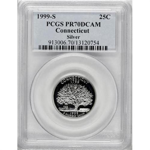 <B>1999-S 25C Connecticut Silver PR70 Deep Cameo PCGS.</B></I> A gleaming, technically perfect example with incredible contrast between the decisively struck devices and the flawless mirrors. One of only 39 pieces assigned this ultimate grade by PCGS (3/08).<BR><BR><b>Shipping:</b> Coins & Currency (<a target="_blank" href="http://www.heritageauctions.com/common/shipping.php">view shipping information</a>)