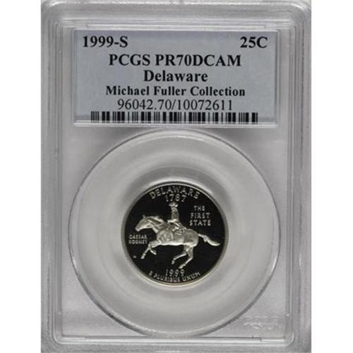<B>1999-S 25C Delaware Clad PR70 Deep Cameo PCGS.</B></I> Ex: Michael Fuller Collection. An impressive proof specimen with deep mirror fields and richly frosted devices that betray a hint of golden toning. Even careful examination with a magnifier fails to reveal the slightest flaw on either side. Population: 34 in 70 Deep Cameo (10/07). <BR><I>From The Michael Fuller Collection.</B></I><BR><BR><b>Shipping:</b> Coins & Currency (<a target="_blank" href="http://www.heritageauctions.com/common/shipping.php">view shipping information</a>)