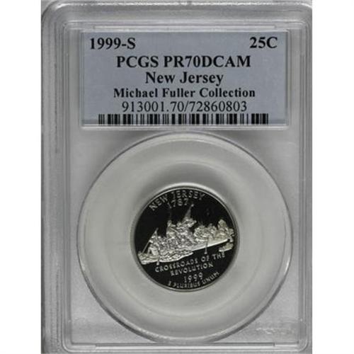 <B>1999-S 25C New Jersey Clad PR70 Deep Cameo PCGS.</B></I> The design motifs are fully brought up, and the proof surfaces are immaculate. Tremendous field-to-device contrast is presented on both sides of this flawless specimen, from the first year of the Statehood quarter program. <BR> <BR><I>From The Michael Fuller Collection.</B></I><BR><BR><b>Shipping:</b> Coins & Currency (<a target="_blank" href="http://www.heritageauctions.com/common/shipping.php">view shipping information</a>)