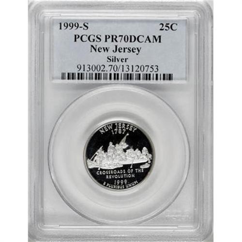 <B>1999-S 25C New Jersey Silver PR70 Deep Cameo PCGS.</B></I> A flashy and essentially untoned example with impressive contrast and magnificently preserved surfaces. PCGS has graded just 31 perfect coins with the Deep Cameo modifier (3/08).<BR><BR><b>Shipping:</b> Coins & Currency (<a target="_blank" href="http://www.heritageauctions.com/common/shipping.php">view shipping information</a>)