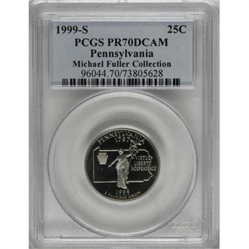 <B>1999-S 25C Pennsylvania Clad PR70 Deep Cameo PCGS.</B></I> This is a gorgeous Deep Cameo proof from the initial year of the highly successful Statehood quarter program. All of the proofs from this series will be produced at the San Francisco Mint. The design motifs exhibit razor-sharp definition, and the expertly preserved surfaces are virtually flawless. Population: 53 in 70 Deep Cameo (10/07). <BR><I>From The Michael Fuller Collection.</B></I><BR><BR><b>Shipping:</b> Coins & Currency (<a target="_blank" href="http://www.heritageauctions.com/common/shipping.php">view shipping information</a>)
