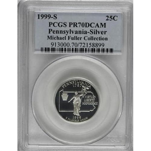 <B>1999-S 25C Pennsylvania Silver PR70 Deep Cameo PCGS.</B></I> An attractive depiction of a Roman-attired female appears on the Pennsylvania Statehood quarter, along with a silhouette map of the state and the state motto: "Virtue, Liberty, Independence." This exactingly struck specimen seems virtually flawless, both in terms of execution and preservation. Population: 24 in 70 Deep Cameo (10/07). <BR><I>From The Michael Fuller Collection.</B></I><BR><BR><b>Shipping:</b> Coins & Currency (<a target="_blank" href="http://www.heritageauctions.com/common/shipping.php">view shipping information</a>)