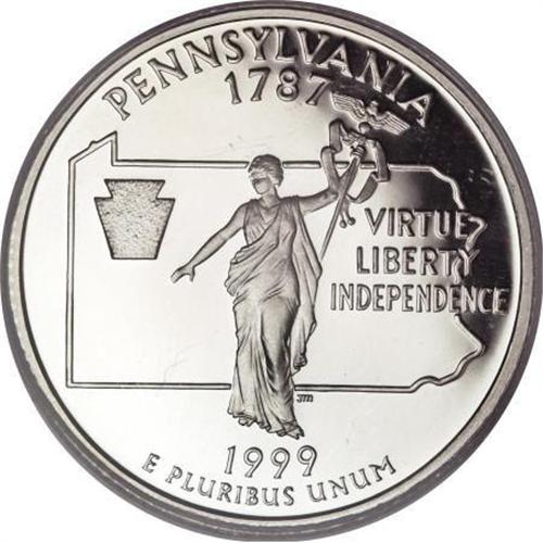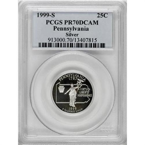 <B>1999-S 25C Pennsylvania Silver PR70 Deep Cameo PCGS.</B></I> The Pennsylvania silver quarter in PR70DCAM shows a lower certified population--29 coins--than any of the other 1999-S issues, with the sole exception of the silver Delaware--19 pieces. This Pennsylvania demonstrates incredibly pure, silvery surfaces free of even the most remote distraction.<BR><BR><b>Shipping:</b> Coins & Currency (<a target="_blank" href="http://www.heritageauctions.com/common/shipping.php">view shipping information</a>)