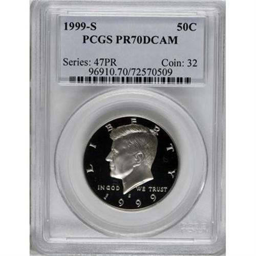 <B>1999-S 50C Clad PR70 Deep Cameo PCGS.</B></I> Fully struck with dark, deep mirror fields and frosted, lightly toned central devices. The surfaces are immaculate. Population: 29 in 70 (11/07). <BR><I>From The Kallenberg #1 PCGS Registry Set Of Proof Half Dollars.</B></I><BR><BR><b>Shipping:</b> Coins & Currency (<a target="_blank" href="http://www.heritageauctions.com/common/shipping.php">view shipping information</a>)