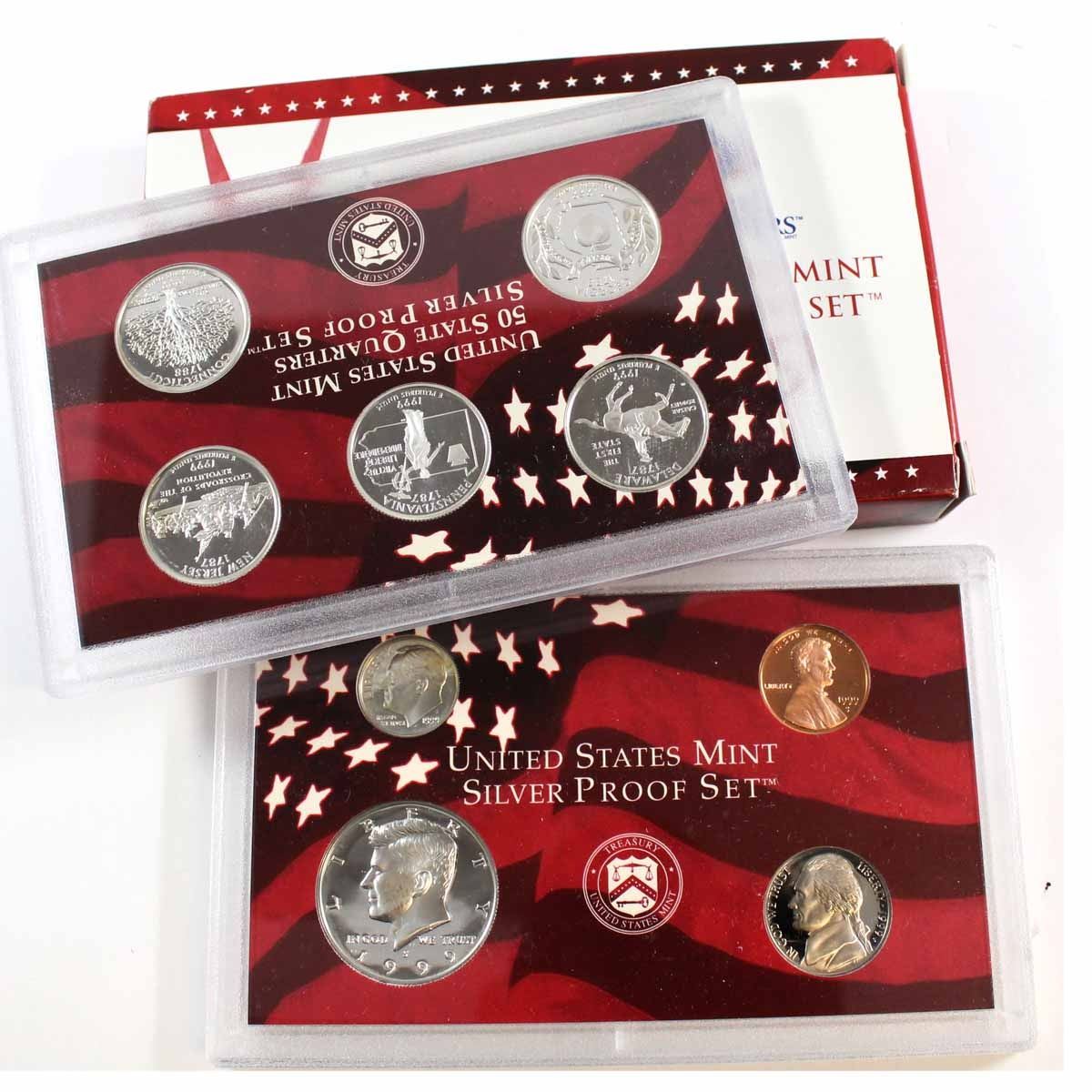 1999-S United States Silver Proof 9-Coin Set. Please note coins have light toning and plastic holders have light scratches.