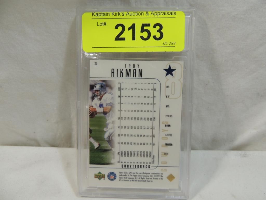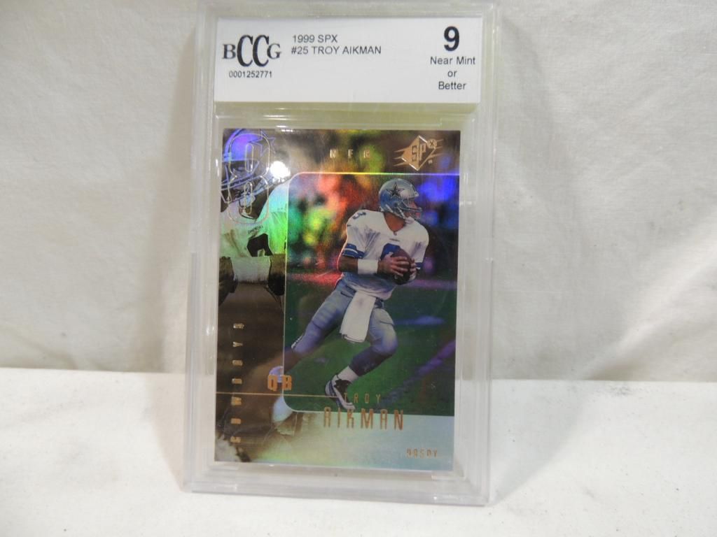 1999 SPX TROY AIKMAN #25 GRADED 9 NEAR MINT OR BETTER BY BCCG FOOTBALL PLAYER CARDS. TRADING CARDS. COLLECTIBLE. FOOTBALL MEMORABILIA. GOOD CONDITION AS SHOWN. SEE PHOTO FOR MORE DETAILS.