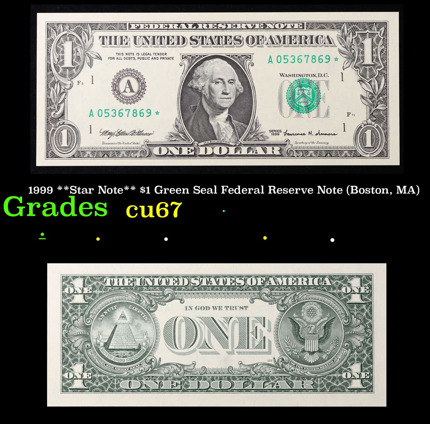 1999 **Star Note** $1 Green Seal Federal Reserve Note (Boston, MA) Grades Gem++ CU