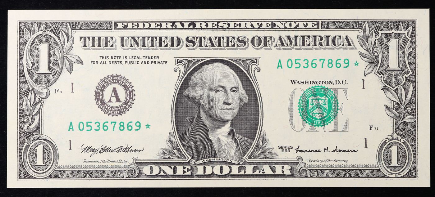 1999 **Star Note** $1 Green Seal Federal Reserve Note (Boston, MA) Grades Gem++ CU. When notes are discovered that have been printed incorrectly (such as having the serial numbers upside down, etc.) the misprinted "error notes" are replaced with star notes because no two bills within a certain series can be produced with the same serial number. They are used to maintain a correct count of notes in a serial number run. By their nature, star notes are more scarce than notes with standard serial numbers and as such are widely collected by numismatists. Some of the highest prices paid for modern (post-1928) U.S. banknotes have been for star notes. The note itself is a Silver Certificate. Silver Certificates were redeemable in Silver. One of their most distinctive qualities is the blue Treasury seal and serial numbers. These notes include an additional legend printed on the face that is not present on any other Federal Reserve notes. The legend states that Silver had been deposited in the Treasury and was payable on demand to the note’s bearer.