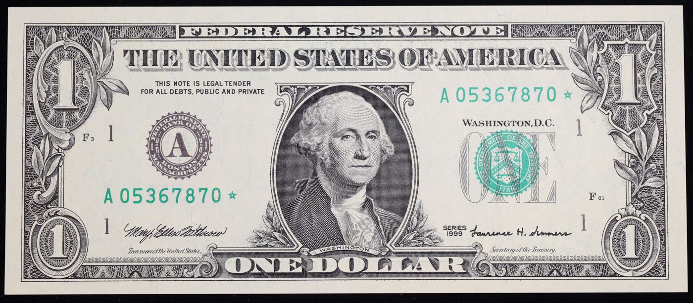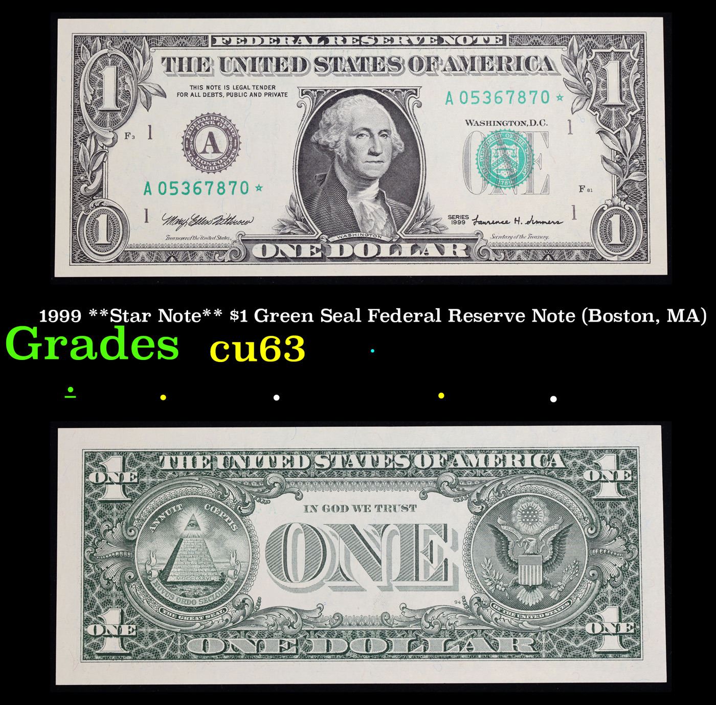 1999 **Star Note** $1 Green Seal Federal Reserve Note (Boston, MA) Grades Select CU