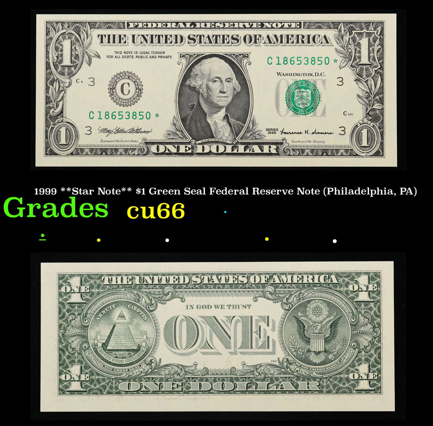 1999 **Star Note** $1 Green Seal Federal Reserve Note (Philadelphia, PA) Grades Gem+ CU