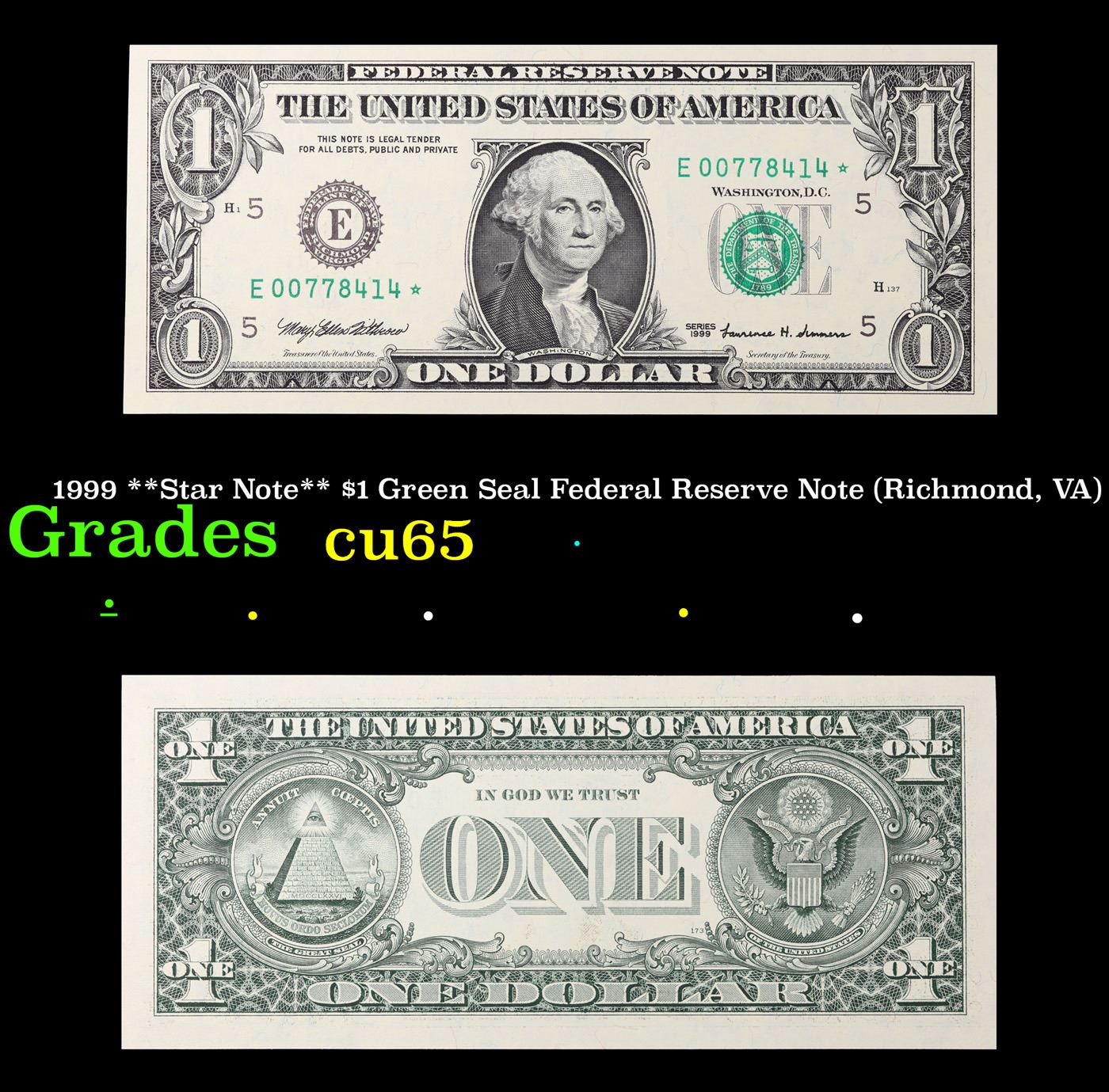 1999 **Star Note** $1 Green Seal Federal Reserve Note (Richmond, VA) Grades Gem CU