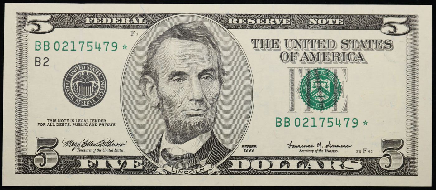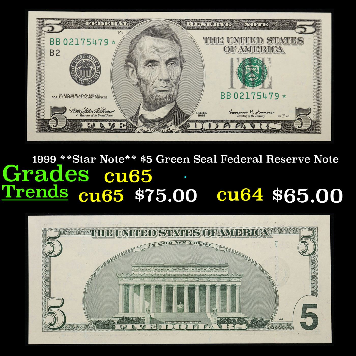 1999 **Star Note** $5 Green Seal Federal Reserve Note Grades Gem CU. When notes are discovered that have been printed incorrectly (such as having the serial numbers upside down, etc.) the misprinted "error notes" are replaced with star notes because no two bills within a certain series can be produced with the same serial number. They are used to maintain a correct count of notes in a serial number run. By their nature, star notes are more scarce than notes with standard serial numbers and as such are widely collected by numismatists. Some of the highest prices paid for modern (post-1928) U.S. banknotes have been for star notes.