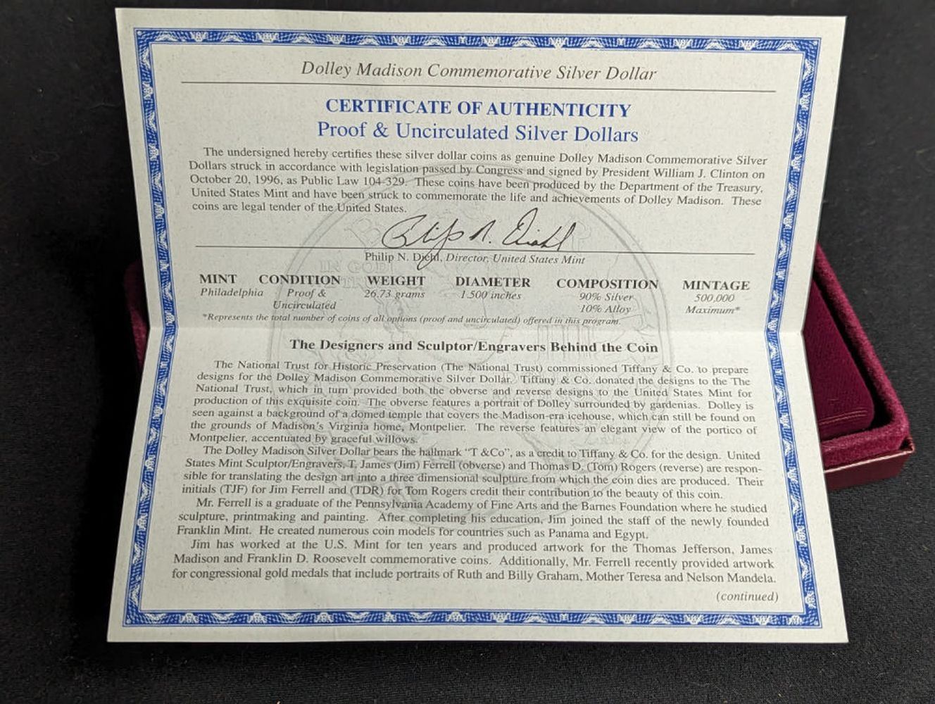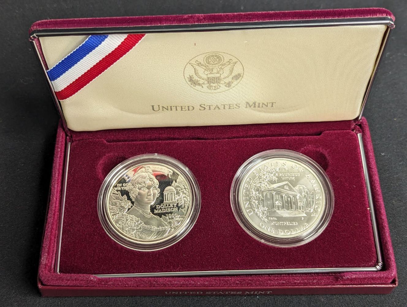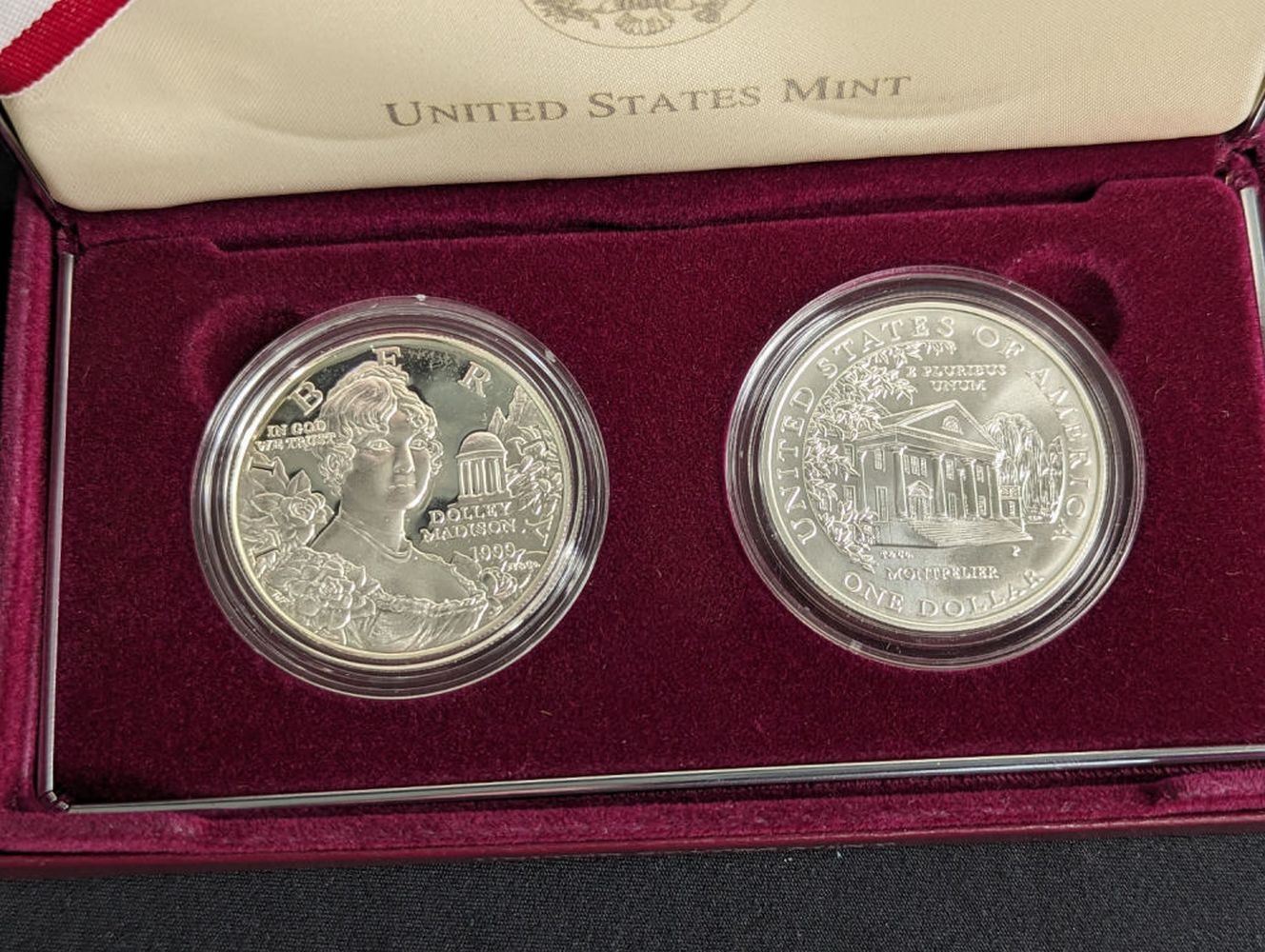 A& nbsp; US Dolly Madison 2pc Silver Dollar Commemorative Set. Comes with the 1999 P BU Silver Dollar and 1999 S Proof Commemorative coins These coins were designed by Tiffany and Co and are the only US coins designed by a private mint and the only coins to carry a private mint hallmark. Very pretty issue and great collectible.