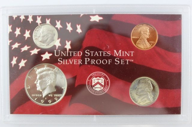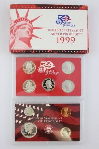 This wonderful lot is this original 1999 Silver Proof Set. Nine coins in two panels, with original box and certification. The Lincoln cent to Kennedy half are represented in this set. First year of issue for the Statehood quarters which are: Delaware, Pennsylvania, New Jersey, Georgia and Connecticut. The dime, quarters and Kennedy Half are of the 90% silver composition. This set has a value of over $100!!!