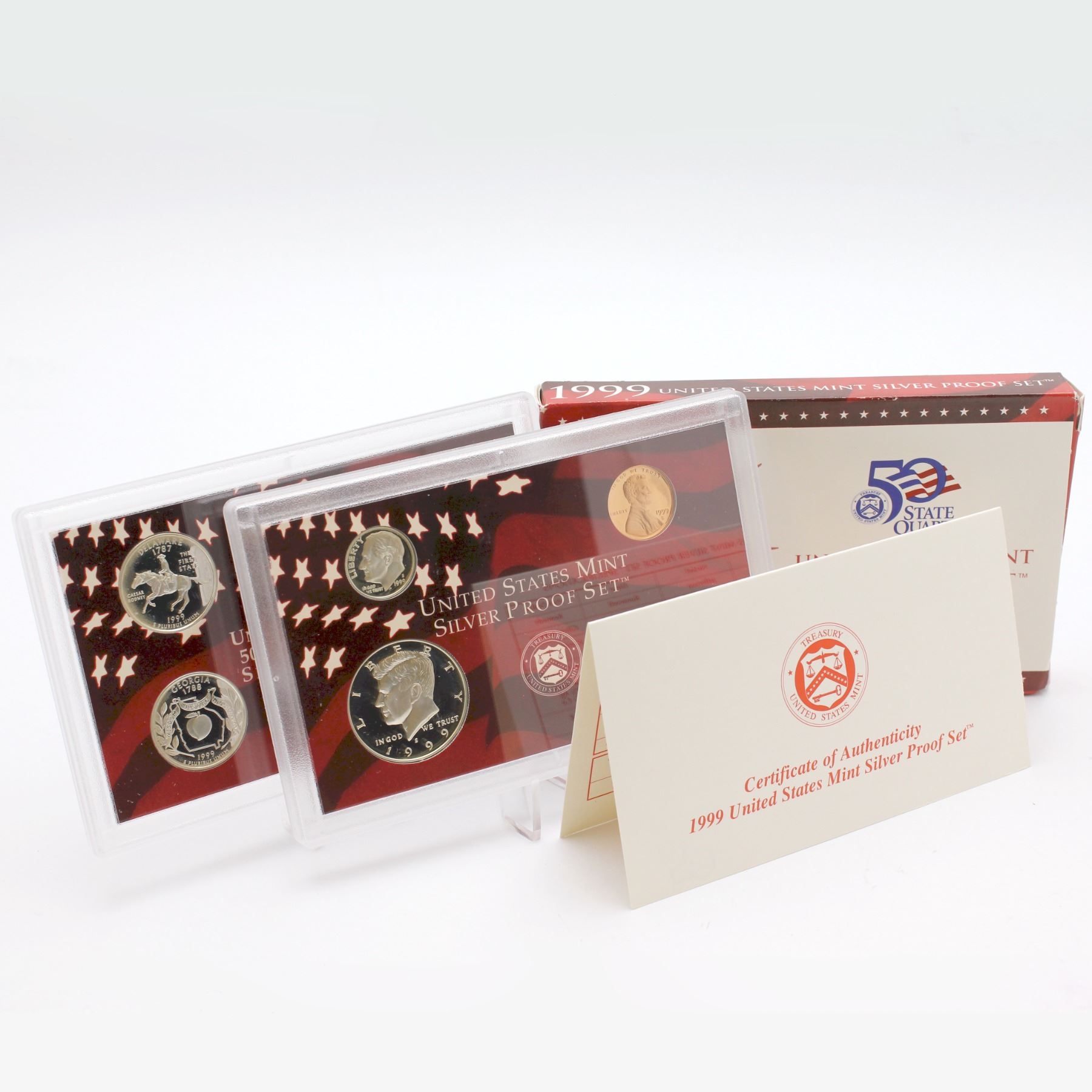 1999 United States mint 10-coin Silver Proof set with original box and COA. Some coins may have natural toning or tarnish.