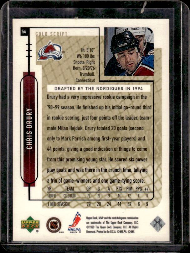 1999 Upper Deck MVP RC 75/100 Chris Drury #54