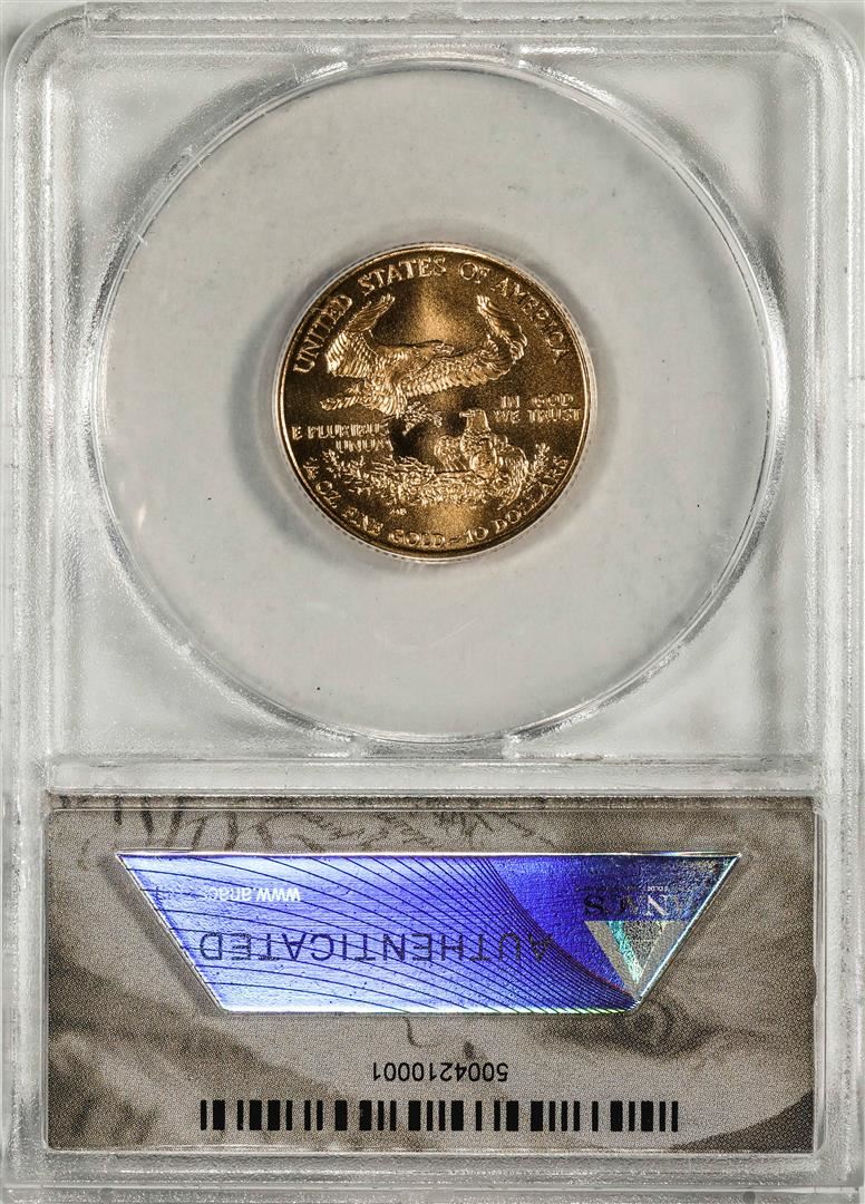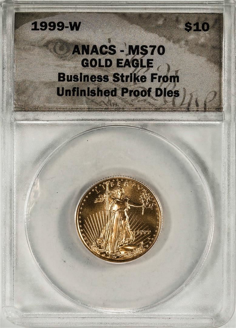 One 1999-W $10 American Gold Eagle Coin ANACS MS70 Unfinished Proof Dies. ANACS Certified.