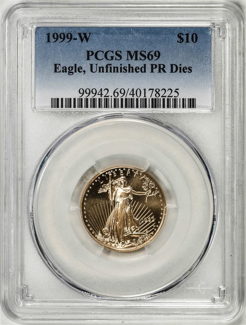 One 1999-W $10 American Gold Eagle Coin PCGS MS69 Unfinished Proof Dies. PCGS Graded.