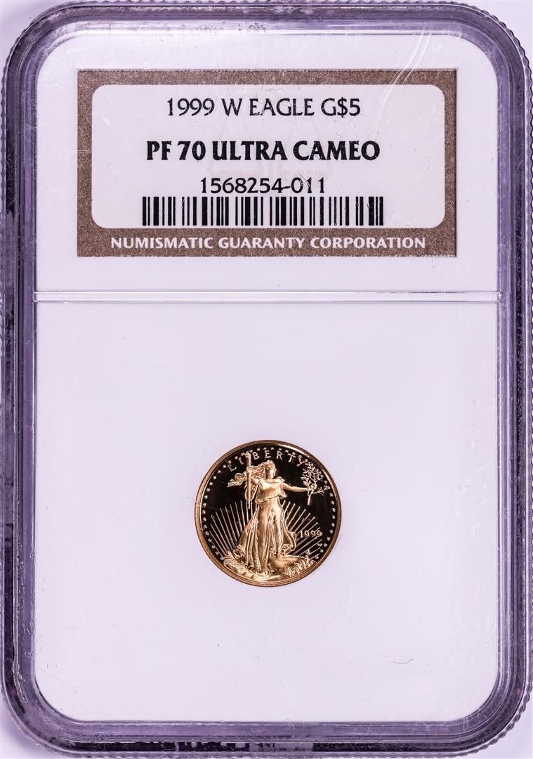One 1999-W $5 Proof American Gold Eagle Coin NGC PF70 Ultra Cameo. NGC Certified.