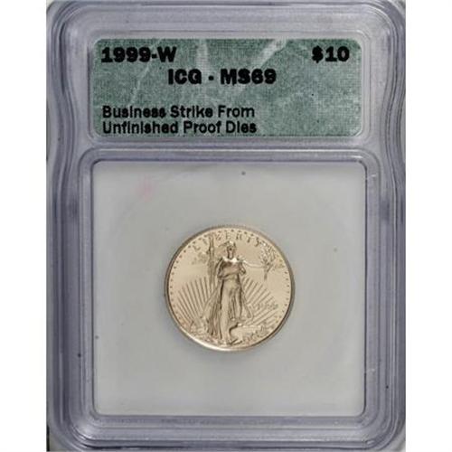 <B>1999-W G$10 Quarter-Ounce Gold Eagle--Business Strike From Unfinished Proof Dies--MS69 ICG.</B></I> NGC Census: (0/0). PCGS Population (869/0). (#99942)<BR><BR><b>Shipping:</b> Coins & Currency (<a target="_blank" href="http://www.heritageauctions.com/common/shipping.php">view shipping information</a>)