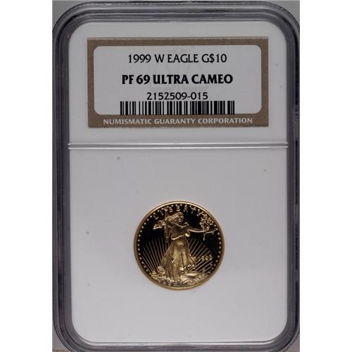<B>1999-W G$10 Quarter-Ounce Gold Eagle PR69 Deep Cameo NGC.</B></I> NGC Census: (339/208). PCGS Population (693/11). Numismedia Wsl. Price: $213. (#9942)<BR><BR><b>Shipping:</b> Coins & Currency (<a target="_blank" href="http://www.heritageauctions.com/common/shipping.php">view shipping information</a>)