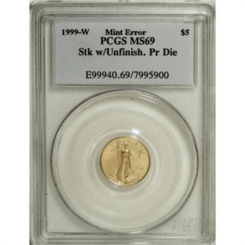 <B>1999-W G$5 Tenth-Ounce Gold Eagle MS69 PCGS.</B></I> PCGS Population (1246/1). NGC Census: (0/0). (#99940)<BR><BR><b>Shipping:</b> Coins & Currency (<a target="_blank" href="http://www.heritageauctions.com/common/shipping.php">view shipping information</a>)
