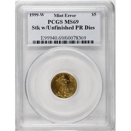 <B>1999-W G$5 Tenth-Ounce Gold Eagle--Struck with unfinished Proof Dies--MS69 PCGS.</B></I> <BR><BR><b>Shipping:</b> Coins & Currency (<a target="_blank" href="http://www.heritageauctions.com/common/shipping.php">view shipping information</a>)